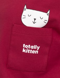 این تیشرت نیم تنه دارای یک جیب در قسمت سمت چپ سینه می باشد که بالای آن یک گربه و روی آن نوشته totally kitten چاپ شده است.