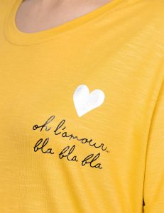 در الگوی این مدل یقه گرد، آستین پاکتی و بغل چاک دار به کار رفته است. قلب و نوشته oh l’amour روی تیشرت چاپ شده است.
