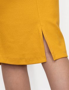 در الگوی این کمر کشی به کار شده است. یک چاک ۱۵ سانتی متری در قسمت پایین پشت دامن وجود دارد.