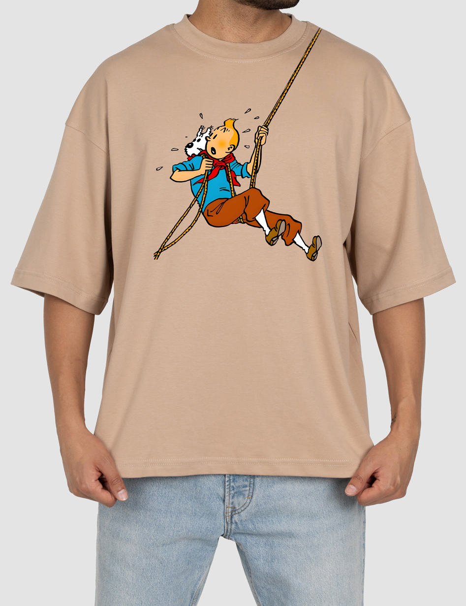 تیشرت باکسی تنتن معلق از برند هیوان، تلفیقی از شوخطبعی و ماجراجویی است. تصویر نمادین تنتن و اسنوی در حال آویزان شدن از طناب، حس هیجان و تحرک را به طرح بخشیده و برای استایلهای روزمره خاص و پرانرژی عالی است. پارچهی پنبه ضخیم باکیفیت و فرم آزاد باکسی، راحتی و خنکی را برای هر فصل فراهم میکند.