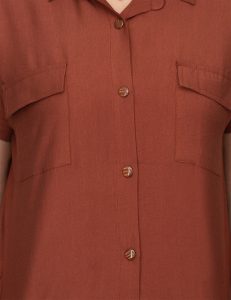 این شومیز زنانه دارای آستین پاکتی, دو جیب در قسمت جلو و 5 دکمه که باز و بسته می شوند.